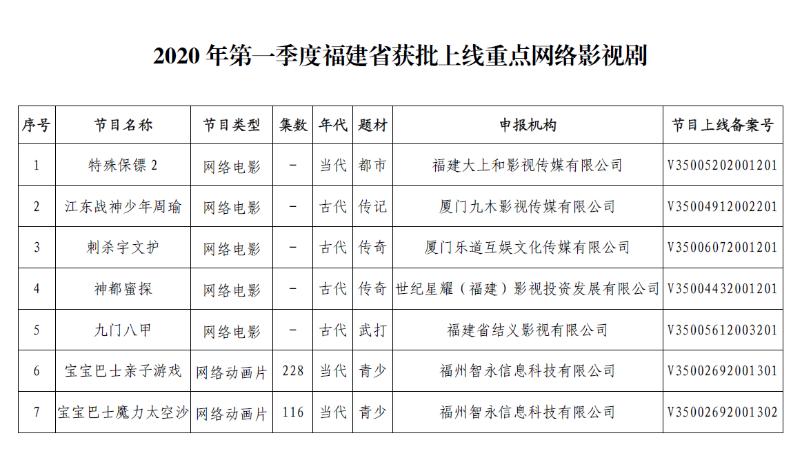 7部获批上线的重点网络影视剧分别为:网络电影《特殊保镖2》、《江东战神少年周瑜》、《刺杀宇文护》、《神都蜜探》、《九门八甲》;228集网络动画片《宝宝巴士亲子游戏》、116集网络动画片《宝宝巴士魔力太空沙》。