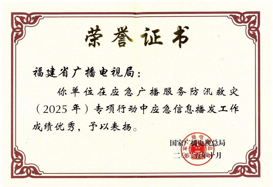 10月14日至15日,国家广播电视总局在云南省昆明市召开全国应急广播体系建设现场推进会暨2025年应急广播服务防汛救灾专项行动总结会。会议全面总结专项行动开展成效,表彰先进集体和优秀案例,福建省广播电视局获评应急广播服务防汛救灾(2025年)专项行动应急信息播发优秀单位(全国广电系统仅10家),选送的福建省长汀县应急广播服务防汛救灾案例入选国家广电总局优秀案例。