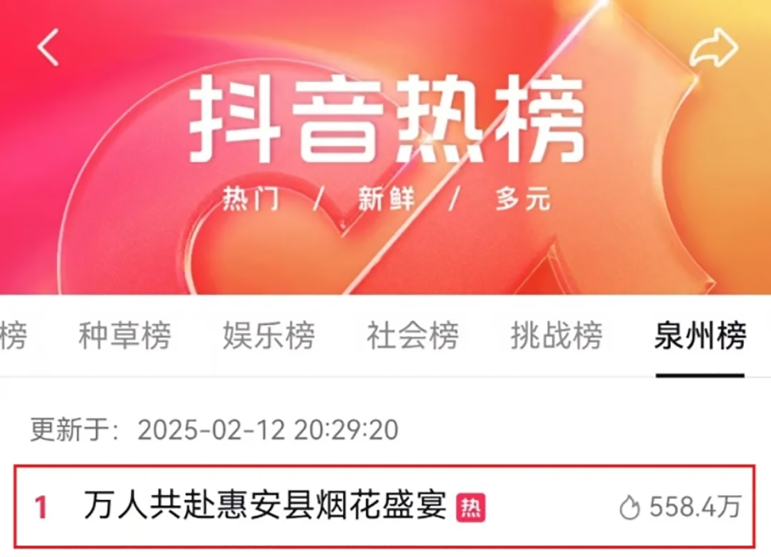 用好惠安县影视协会,汇聚一批积极向上、有影响力的本地自媒体、网红大V,与5家企业建立战略合作关系,构建“主流媒体+自媒体+群众”传播矩阵,让用户生产成为源头活水,实现多圈层、跨领域传播。今年,惠安新春烟花秀火出圈,话题“万人共赴惠安县烟花盛宴”连续三天霸榜抖音泉州榜。