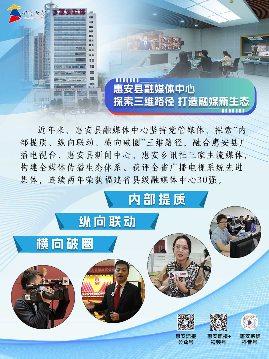 近年来,惠安县融媒体中心坚持党管媒体,探索“内部提质、纵向联动、横向破圈”三维路径,融合惠安县广播电视台、惠安县新闻中心、惠安乡讯社三家主流媒体,构建全媒体传播生态体系,获评福建省广播电视系统先进集体,连续两年荣获福建省优秀县级融媒体中心30强。