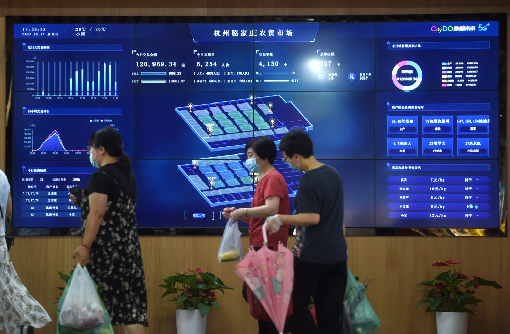 浙江省杭州市的5G农贸市场——骆家庄农贸市场的大屏幕上实时显示交易、客流等相关情况(2020年5月17日摄)。新华社记者 韩传号 摄