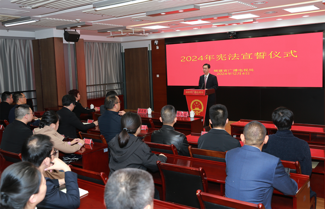 12月4日,省广播电视局举行宪法宣誓仪式,局机关、局属单位新提任及职级晋升的10名干部进行了宪法宣誓。受局党组书记、局长王中委托,局党组成员、副局长陈炎铭监誓并讲话,省纪委监委驻局纪检监察组组长、党组成员廖庆聪出席宪法宣誓仪式。