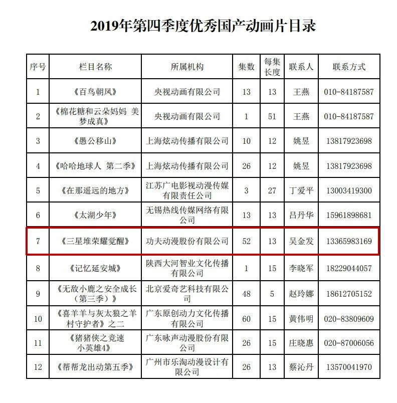 近日,为促进国产电视动画片精品创作生产,充分发挥优秀国产电视动画片的示范带动作用,经省级广播电视行政管理部门、中央广播电视总台初选,国家广播电视总局组织专家评审,确定12部国产电视动画片为2019年第四季度推荐播出优秀片目,推荐全国各级电视台特别是上星综合频道、动画少儿频道、地面少儿频道优先安排播出。