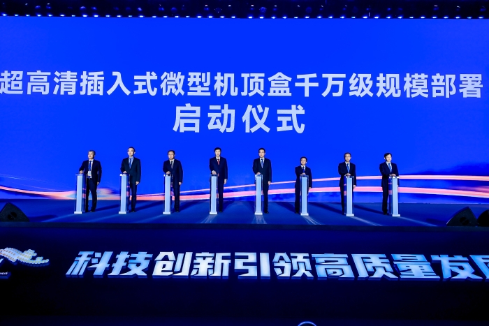 4月22日上午,超高清插入式微型机顶盒千万级规模部署启动仪式在第三十一届中国国际广播电视信息网络展览会(CCBN2025)开幕式暨主题报告会上举行。国家广播电视总局党组成员、副局长刘建国,工业和信息化部副部长熊继军,国家广播电视总局科技司司长袁敏,工业和信息化部电子信息司副司长史惠康,中国电信集团有限公司党组成员、副总经理唐珂,中国移动通信集团有限公司党组成员、副总经理张冬,中国联合网络通信集团有限公司党组成员、副总经理王利民,中国广播电视网络集团有限公司党委书记、董事长宋起柱等共同出席启动仪式。这是电视操作复杂治理成果应用推广的重要里程碑,标志着巩固深化拓展提升“双治理”工作又迈出新的关键一步。